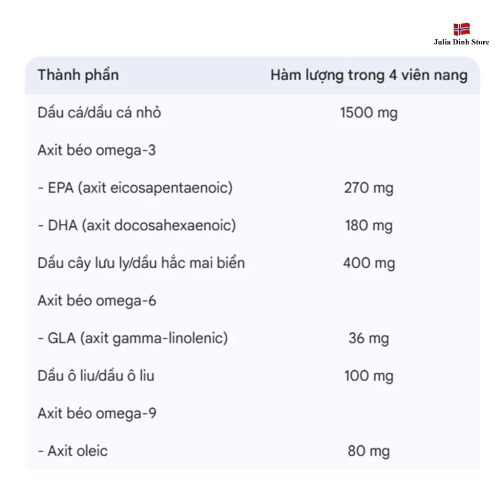 - EPA (axit eicosapentaenoic): 270 mg